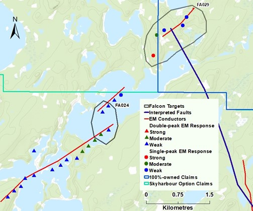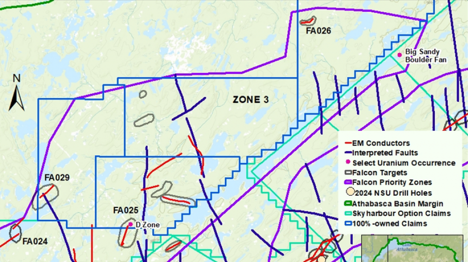 To date, North Shore has identified 36 uranium targets at Falcon with nine of these being in Zone 3 (Figure 1). Most of Zone 3 consists of four claims that are 100%-owned by the Company. The targets are associated with electromagnetic ("EM") conductor anomalies and have been selected based on the analysis of multiple datasets utilizing interpretation by Condor North Consulting LLC ("Condor"), Earthfield Technologies Inc.("Earthfield"), and North Shore. There are three documented uranium occurrences in Zone 3, the D Zone showing (Target FA025), the Big Sandy Boulder Fan and the Geike River Boulder Fan (Sakatchewan SMDI 2455, 2020 and 2456 respectively)(Figure 1). At the D Zone, one sample from a mineralized vein returned 1.26% uranium ("U") and 0.8% molybdenum ("Mo"). Located approximately six kilometres southwest of the D Zone and discovered in 1980, the Geike River Boulder Fan is a 500 m long, 30 to 100 m wide fan consisting of 19 boulders that are 30 to 200 cm diameter. One boulder returned 0.969% U, 215 ppm copper ("Cu") and 472 ppm Mo, another 0.531% U, 1380 ppm Cu and 2,120 ppm Mo. The Big Sandy radioactive boulder field consists of 37 boulders along a 2 km trend, samples from three boulders averaged 1520 ppm U, 425 ppm thorium and 8,670 ppm Mo. In 1980, three holes were drilled by AGIP Canada Ltd. ("AGIP") associated with the D Zone. Also in 1980, AGIP drilled nine shallow holes totaling 810 m approx. one kilometre northeast of the Big Sandy boulder field. One radioactive interval between 18 and 22 m in one of the nine holes returned a maximum of 87 ppm U. Examples of three target areas that are being considered for future work in Zone 3 are FA025, FA029/FA024 and FA026 (Figure 1).